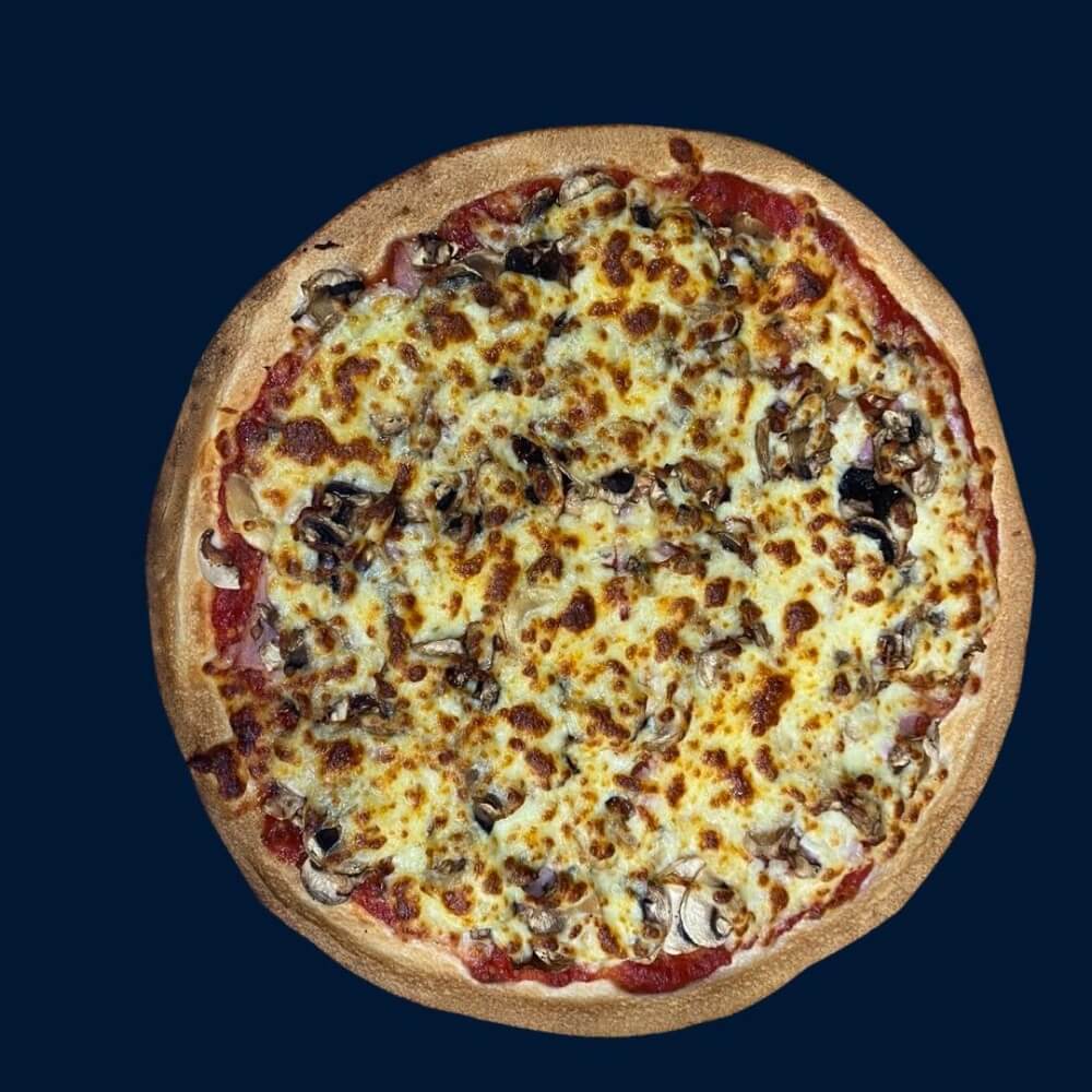 Tomato Sauce, Cheese, Ham, Pepperoni, Mushrooms, Olives.