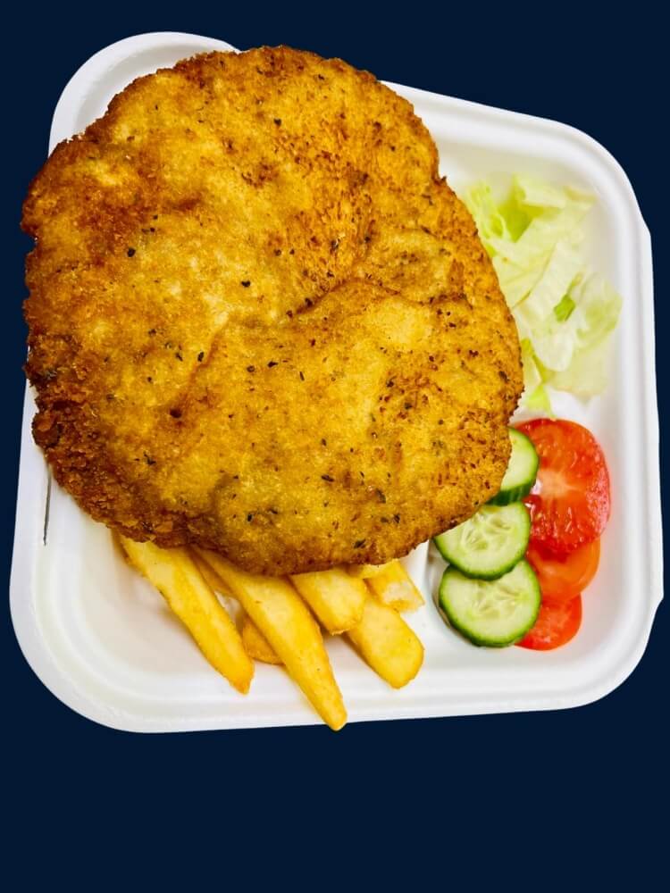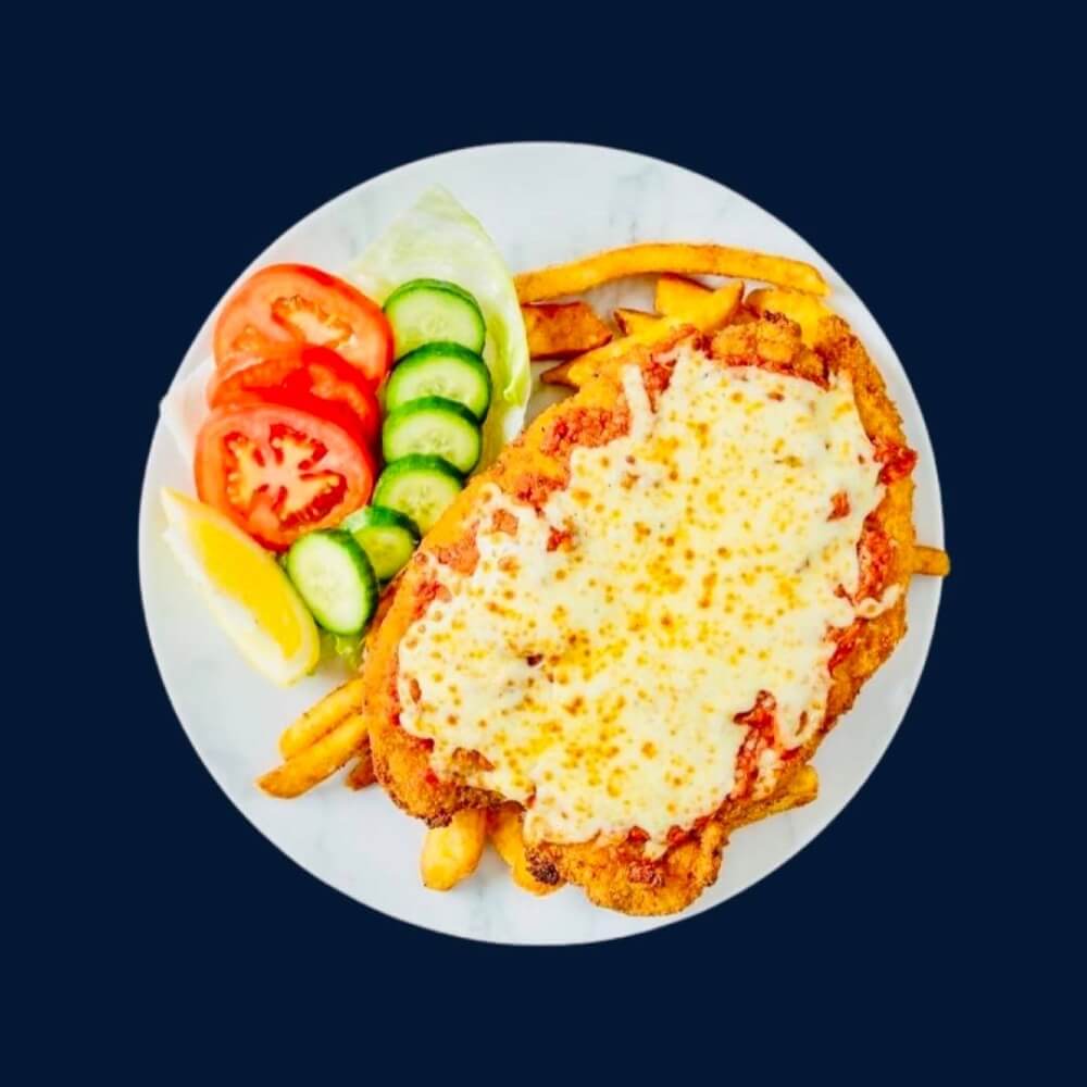 Chicken Breast, Napolitana Sauce & Mozzarella Cheese, served with Chips & Salad
