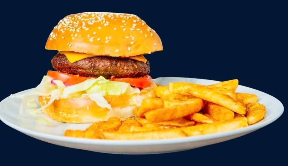Homemoade grilled beef patty topped with cheese, fresh tomato, lettuce, onion relish gherkin, tomato sauce and mayonnaise