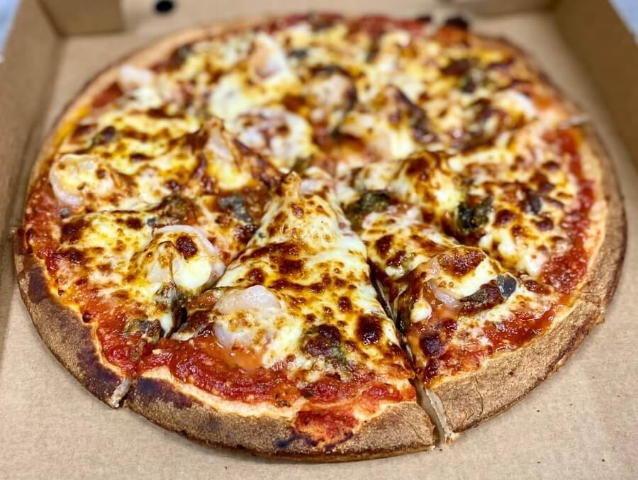Tomato Sauce, Cheese, Pepperoni, Kalamata Olives, Bacon, Prawns, with a touch of Anchovies and Jalapeno, Oregano and Garlic. Mild Spicy